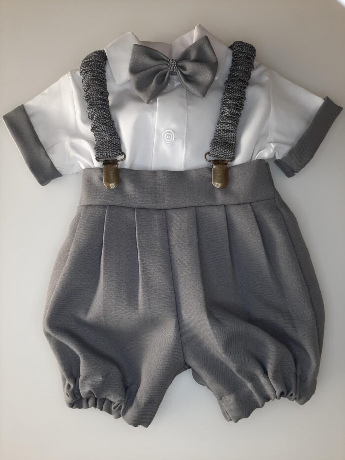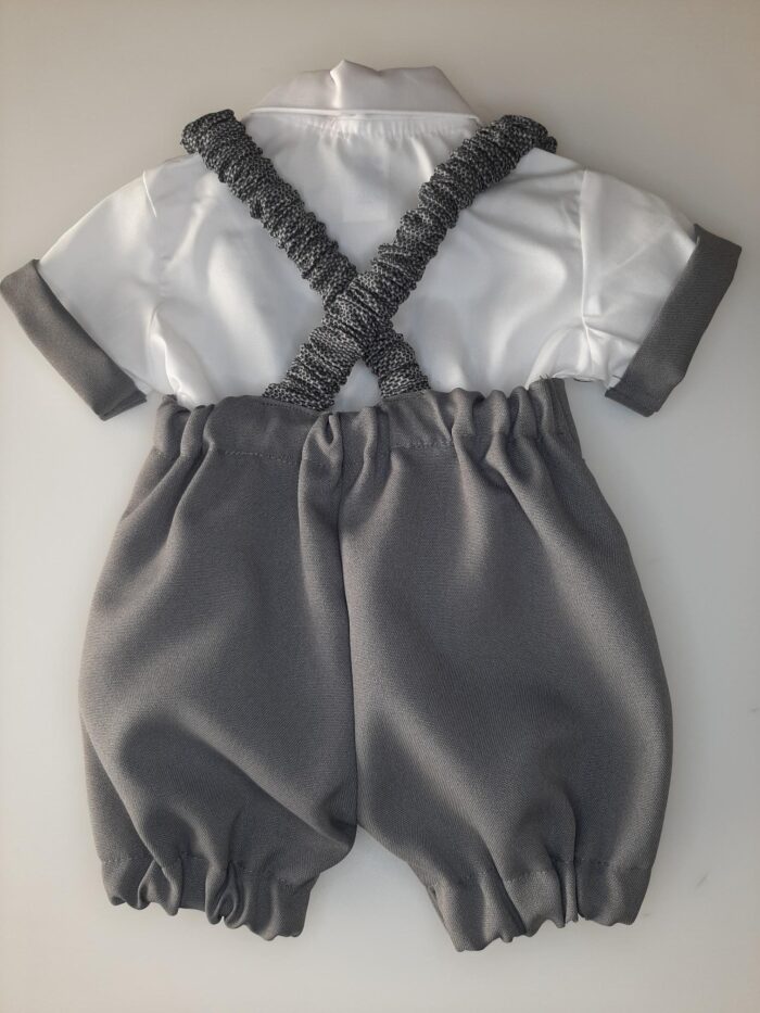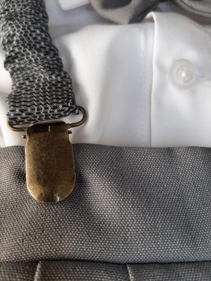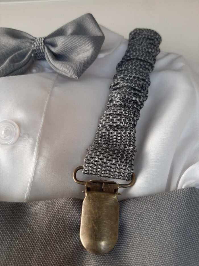Boys Summer Christening Suit – dark grey pants and braces with white cotton shirt & dark grey bowtie