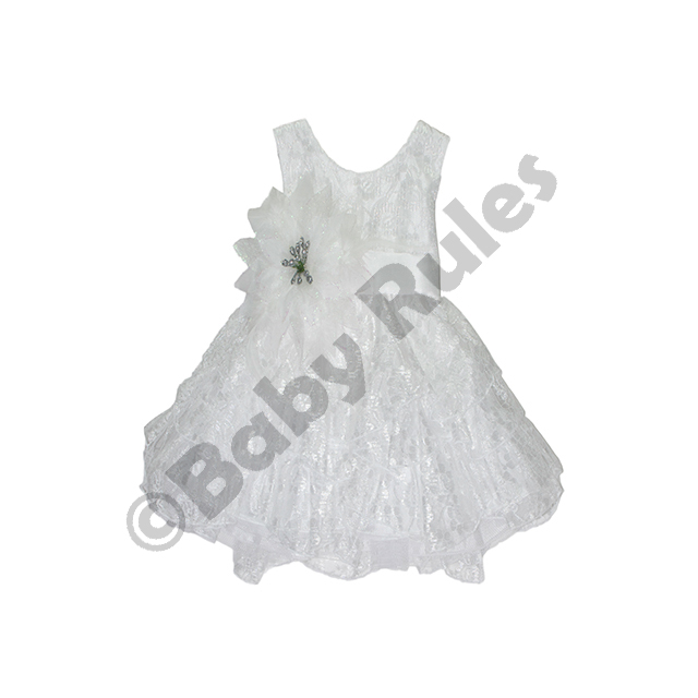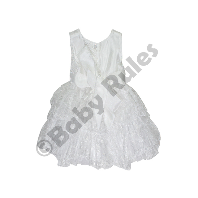 Girls Summer Christening Dress – White Satin Layered Lace Dress With White And Silver Flower