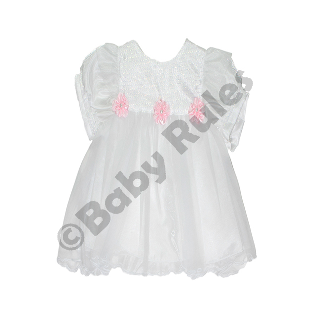 Christening Girls White satin Pantaloon set with chiffon overlay and pink flowers on