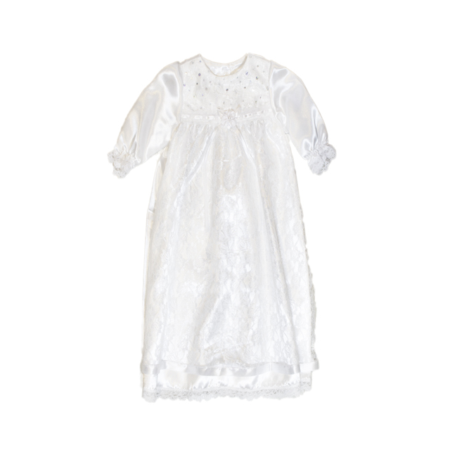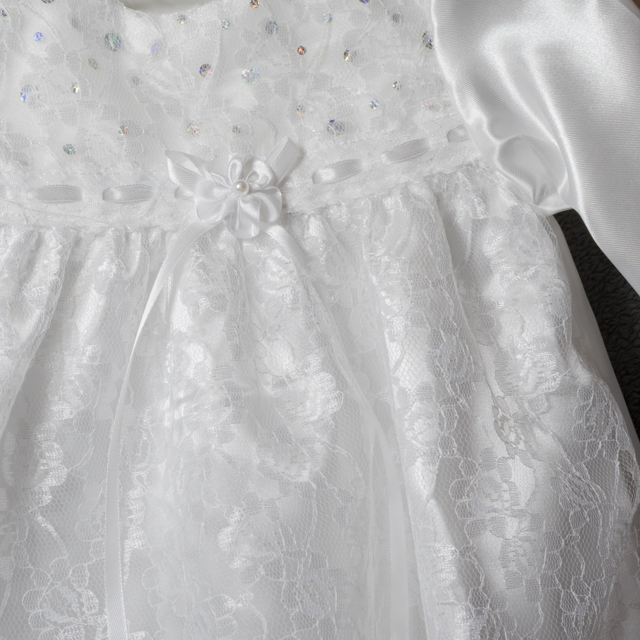 Christening Girls Long winter satin dress with lace overlay; silver polka dot detail